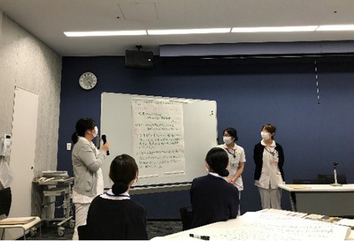 2年目看護職員に対しても教育委員会が継続して関わり、ケーススタディや他部署でのローテーション研修、ミーティング等の研修を通して、自己の看護実践を振り返り、そこから課題を見いだすことで今後の看護に役立てられるようサポートしています。